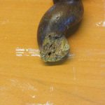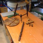Ik heb het krukje meegenomen en onder een werkbank weggelegd met het idee: ik kijk er een keer naar als ik er zin in heb. Ze is verscheidene keren tevoorschijn gehaald omdat het in de weg lag en vervolgens weer teruggelegd omdat ik er tegenop zag om met die gebroken gedraaide poten aan de slag te gaan.