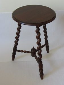 Schoonmoeder omalyn heeft een rijke voorraad aan oude meubels die deels nog door haar grootvader zijn gemaakt. Dat zijn dus spullen die inmiddels zeker 100 jaar oud kunnen zijn. Dit krukje was het eerste object van haar dat ik als startend meubelmaker onder handen heb genomen. Bij een bezoek aan haar liet ze het me zien met de vraag: “kun je daar wat mee?” De staat waarin het krukje verkeerde was abominabel maar ze was er aan gehecht omdat zij (zo’n sierlijk krukje is uiteraard een zij) nog van haar vader of opa was geweest. Toen ik het bekeek bleek zij met spijkers, spaanplaatschroeven, expansielijm en plakband mishandeld te zijn. “Het heeft geen haast hoor en als het niet lukt is het ook goed!” werd er nog bij gezegd.